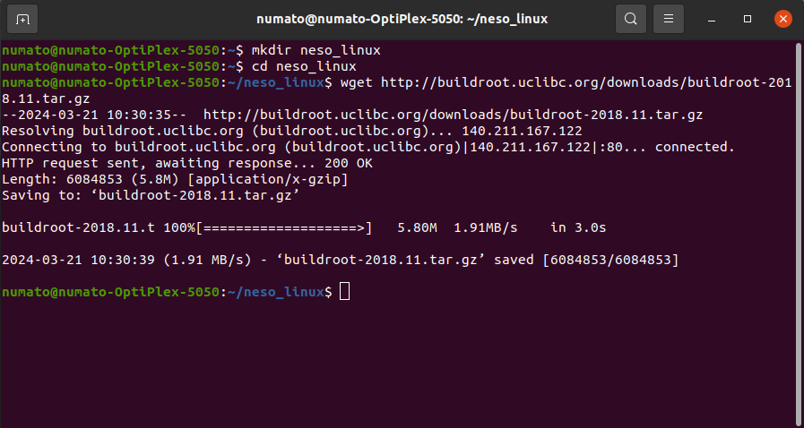 Step 2: Create a convenient folder on your Linux system and ‘cd’ to that folder. The author created a directory with the name “NESOA7_LINUX” in his “home” directory. Now download “buildroot” to the created directory, either manually or by using the following command: