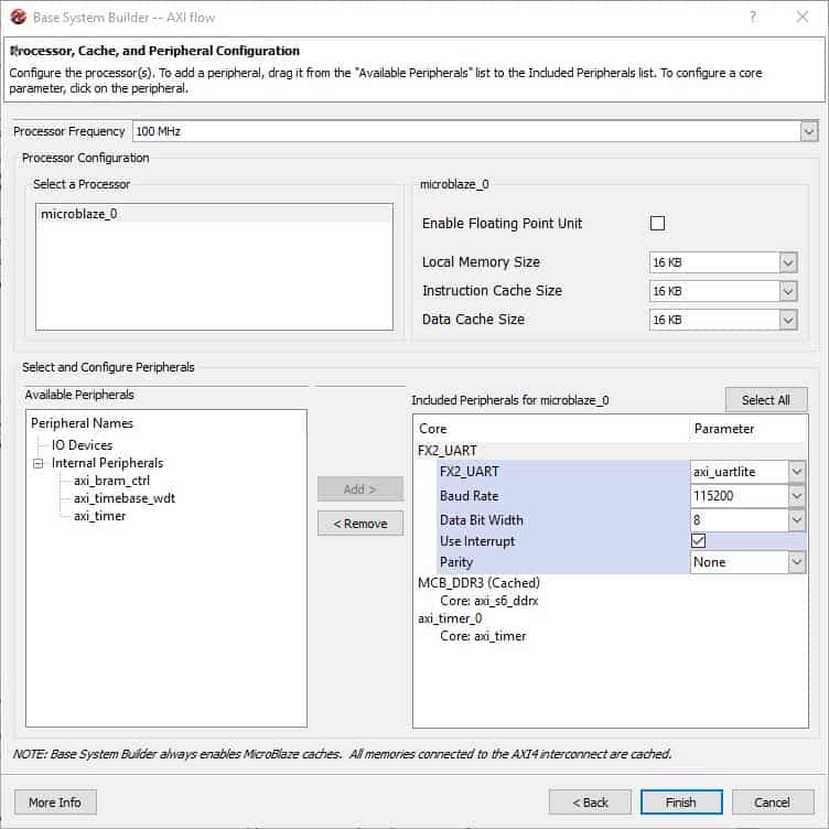 By default, FX2_UART and MCB_DDR3 will be selected. Select memory size, I-cache size and D-cache size as 16KB. Then select FX2_UART peripheral and set the baud rate to 115200 and check the “Use Interrupt” check box. Then select “axi_timer” in the “Available Peripherals” list and add that to the system. Select the timer and check the “Use Interrupt” check box. Make sure everything is setup as shown in the image below and click “Finish” button.