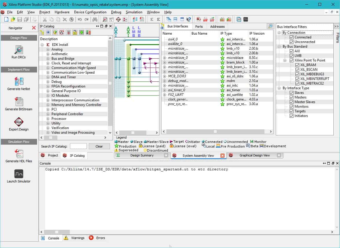 FPGAs are best known for their flexibility and versatility. Such flexibility allows FPGAs not only to be used for custom logic circuits but also implement a processor on it and even run Linux (or other operating system) on the processor. The possibilities are only limited by imagination, and also by FPGA speed grade and size. Numato Opsis FPGA Platform is perfectly capable of running Linux with Xilinx’s popular Microblaze 32-bit soft processor. This article will discuss how to create/implement Microblaze processor and run Linux on Numato Opsis. This series is based on our article series for Spartan 6 FPGA Module. So we highly recommend that you read the series for Saturn and get yourself familiar with the steps.