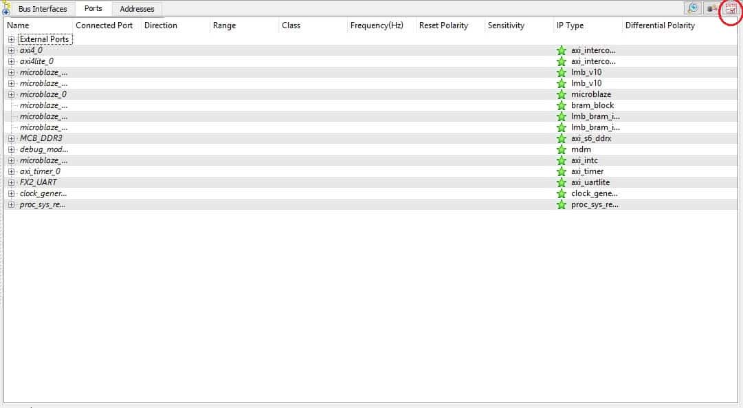 At this point, we have finished configuring Microblaze CPU and all peripherals. The next step is to route all peripheral interrupts to the microblaze CPU through the interrupt controller. To configure interrupts, go to the “Ports” tab in “System Assembly View” and locate the “Open interrupt Control Dialog” button. This button is a little tricky to locate. Please see the image below for help.