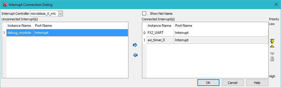 In the interrupt control dialog box, make sure that both FX2_UART and axi_timer_0 are connected to the interrupt controller and debug_module is not connected to the interrupt controller as shown in the image below.