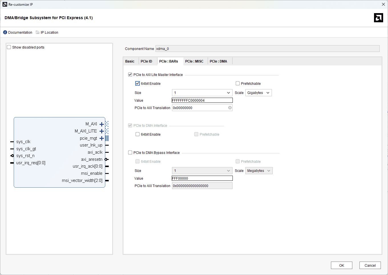 In the PCIe:BARs tab, enable the PCIe to AXI Lite Master Interface, 64 bit enable and change the scale to Gigabytes. And click OK.