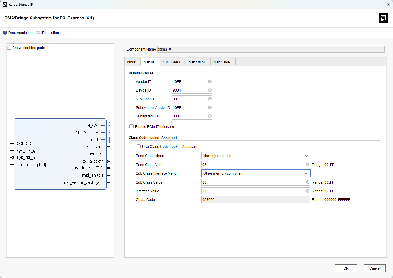 In the PCIe ID tab, change the Base Class Menu to "Memory controller" and the Sub Class Interface Menu to "Other Memory Controller".