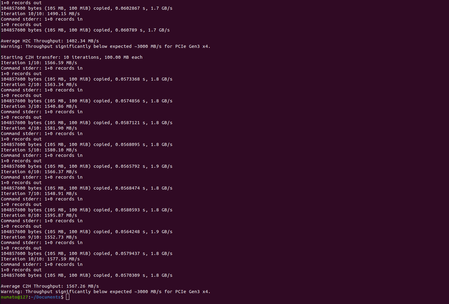 To measure the PCIe DMA throughput, simply download the provided script and run “sudo python3 Aller_throughput_x4.py” command in the terminal. The script automatically performs the transfers and displays the calculated average throughput.