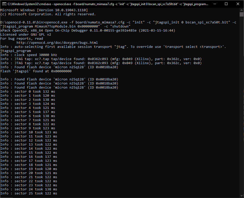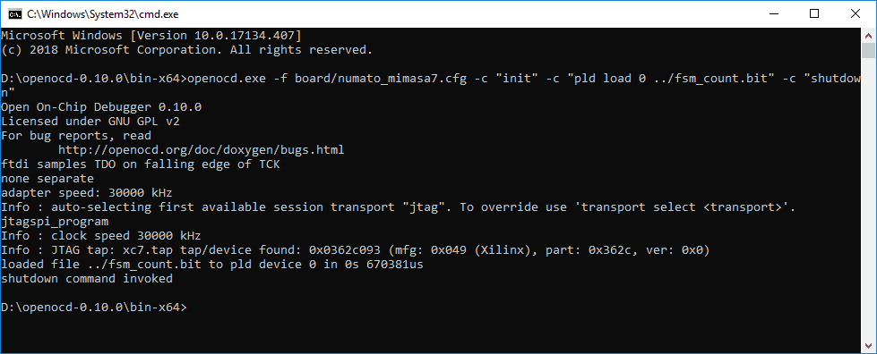 Download numato_mimasa7.cgf from here. Save the downloaded “numato_mimasa7.cfg” file to the “openocd/scripts/board” directory. Open Command Prompt or PowerShell in the “bin-x64” directory which is located in “openocd” folder.