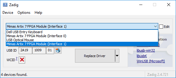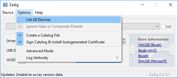To program Mimas A7 through its USB interface, “WinUSB” drivers need to be installed instead of the default drivers installed by Windows. To install “WinUSB” drivers, download and run the latest version of “Zadig“. Go to Options click “List all devices” and select it.