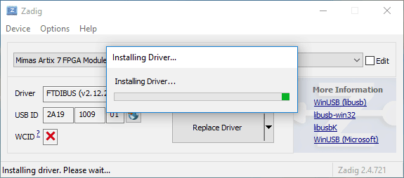 Select “WinUSB” drivers in the target driver to replace the “FTDIBUS” drivers. Click “Replace Driver” to install WinUSB drivers as follows.