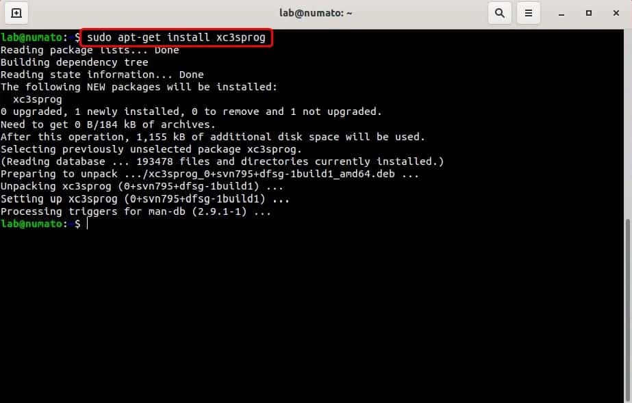 Run the following command in the terminal to download and install XC3SProg in the system: