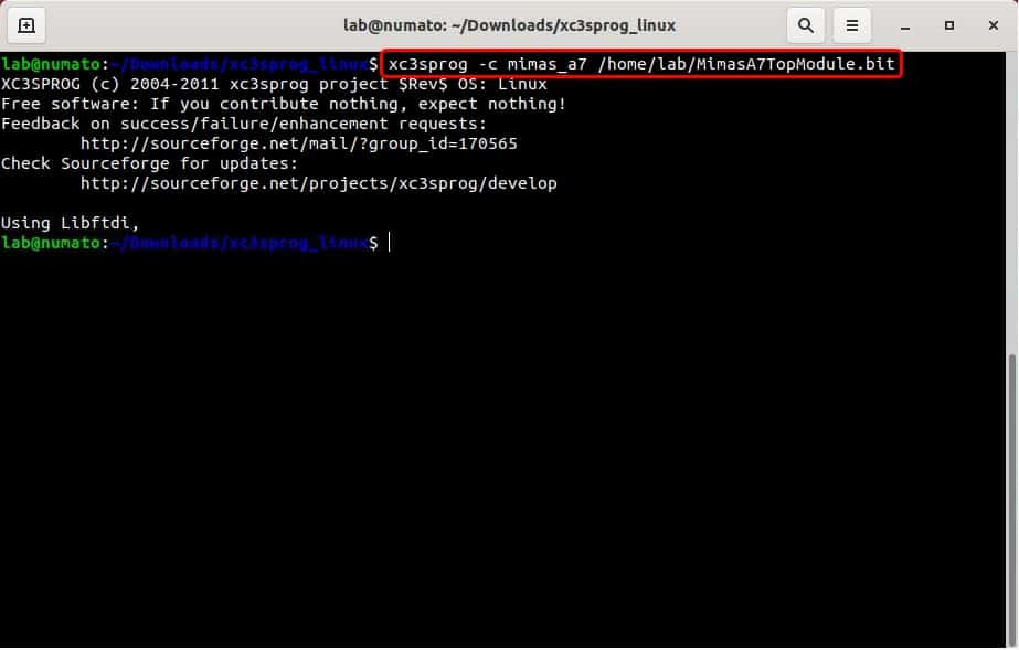 Download XC3SProg files for Mimas A7 from here, and change directory (using cd) to the downloaded folder in the terminal.