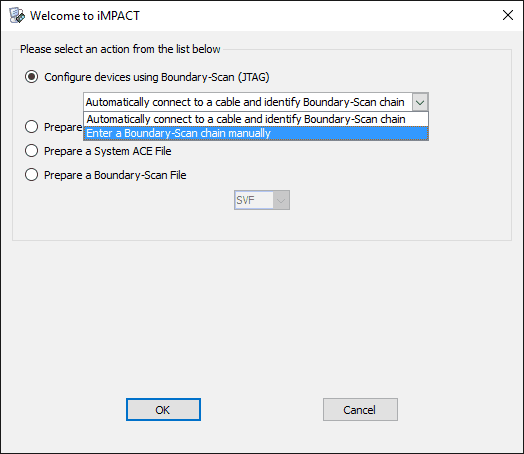 Congratulations, our first step is done. Server is now waiting for connections from Xilinx Virtual Cable driver. Leave this command prompt as is (i.e, don’t close it) and let’s go to iMPACT now. - Open iMPACT and create a new project, or select “Yes” when iMPACT asks upon starting whether to “Automatically create and save a project”. In the dialog window select “Enter a Boundary-Scan chain manually” and click OK: