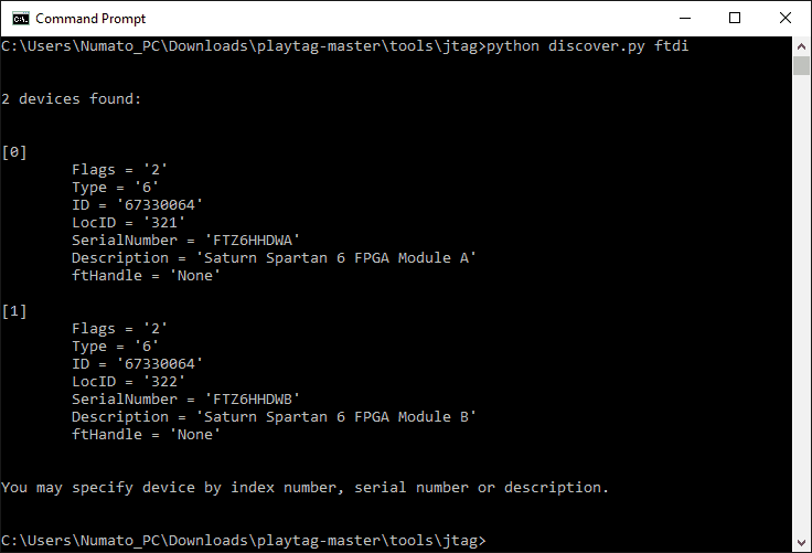 - In the command prompt window we have opened, type and press enter: ‘python discover.py ftdi’ It will give an output something like the image below. Here we are seeing 2 devices because Saturn’s FTDI has 2 independent channels. But, it’s the first channel which is actually connected to FPGA’s JTAG lines. So we will be using Device [0].