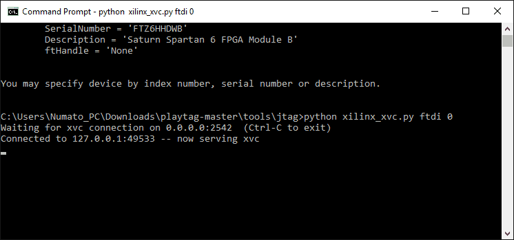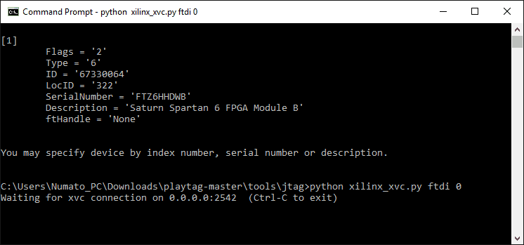 - Now type and enter: ‘python xilinx_xvc.py ftdi 0’ Here 0 refers to Device [0] mentioned before. The output should be something like this now: