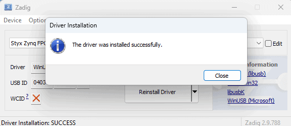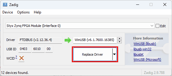 Select “WinUSB” drivers in the target driver to replace the “FTDIBUS” drivers. Click “Replace Driver” to install WinUSB drivers as follows.