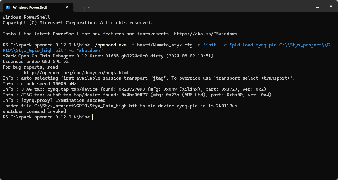 Provided that all steps have been executed correctly, the bitstream has been successfully programmed to the Styx Z7 FPGA using OpenOCD, without the requirement for external JTAG hardware.”