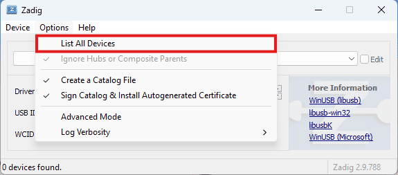 To program the Styx Z7 FPGA Module through its USB interface, “WinUSB” drivers must be installed instead of the default drivers installed by Windows. To install “WinUSB” drivers, download and run the latest version of “Zadig“. Go to Options click “List all devices” and select it.
