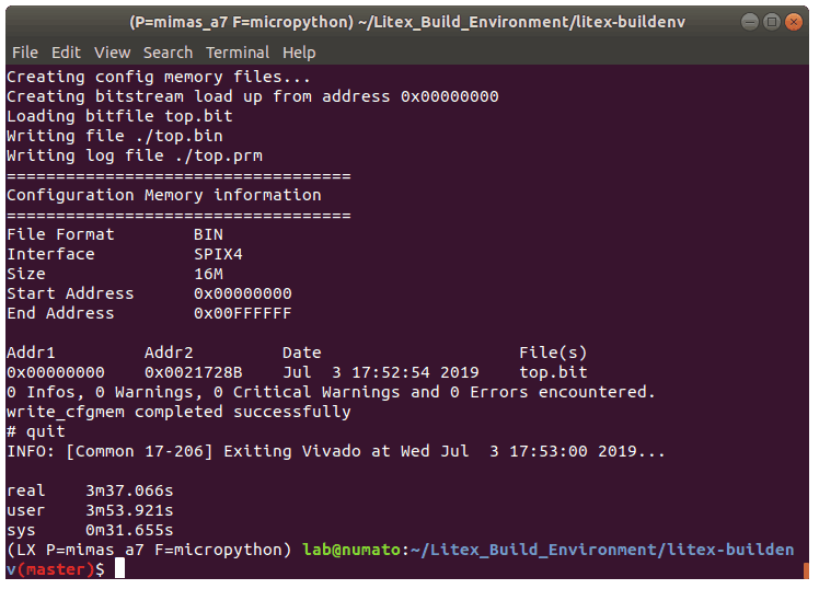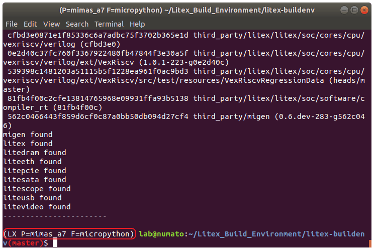 The Litex Build Environment comes with Mimas A7 platform support. The ‘lm32’ and ‘base’ are the default soft CPU and target (SoC configuration) respectively. Litex-buildenv also supports other soft CPUs such as Vexriscv and Picorv32. Run the following command to enter the litex-buildenv environment with the previously set variables: