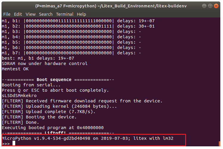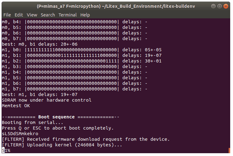 After loading the gateware onto Mimas A7, the MicroPython firmware should start loading on to the soft CPU in the second, newer terminal. The image below shows the MicroPython firmware being loaded to the soft CPU.
