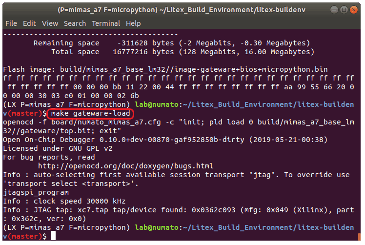 The next step is to load the gateware onto the Mimas A7 board. Going back to the previous terminal, run the following command to load the gateware: