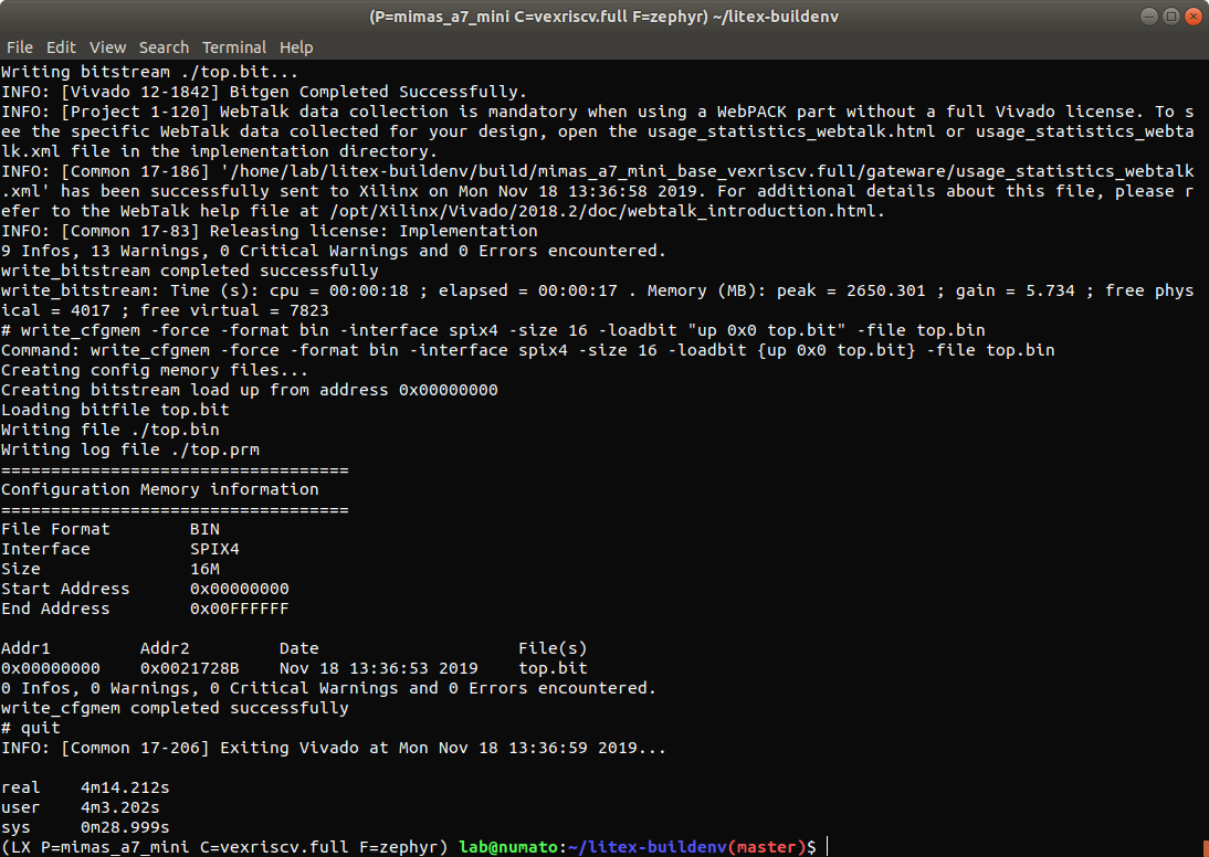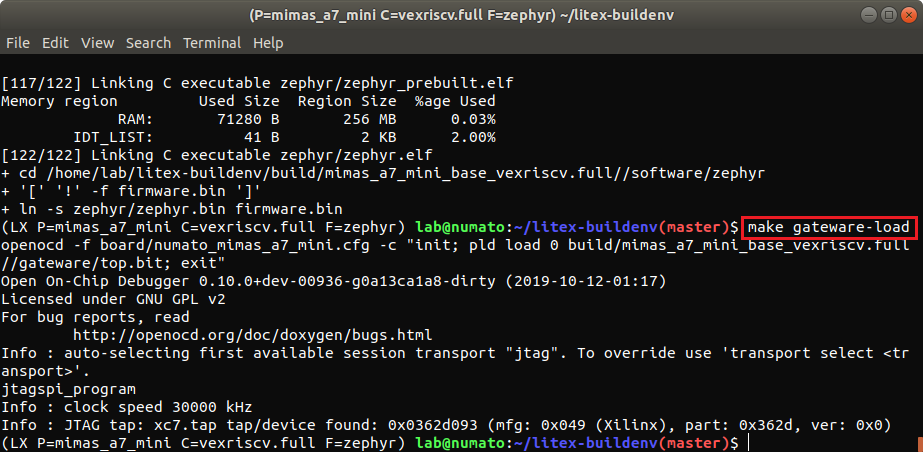 export PLATFORM=mimas_a7_mini CPU=vexriscv CPU_VARIANT=full TARGET=base FIRMWARE=zephyr