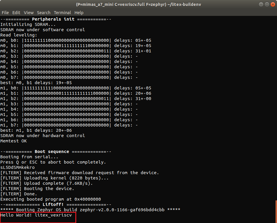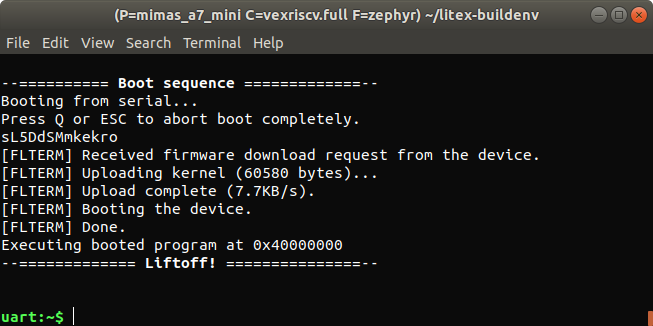 Congratulations on getting the Zephyr OS running successfully on the Vexriscv RISC-V CPU built with LiteX on your Mimas A7 Mini FPGA Development Board.