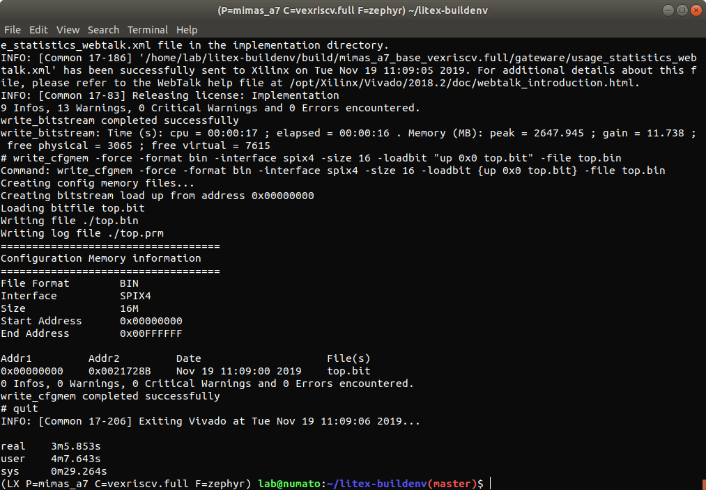 The Litex Build Environment comes with Mimas A7 platform support. We are going to deploy LiteX SoC with the VexRiscv CPU on Mimas A7, so choose CPU as “vexriscv” and CPU variant as “full” to enable all features of the CPU. The litex-buildenv supports many different firmware options such as bare-metal, Linux, MicroPython, Zephyr, etc. For this article, we select FIRMWARE=zephyr.