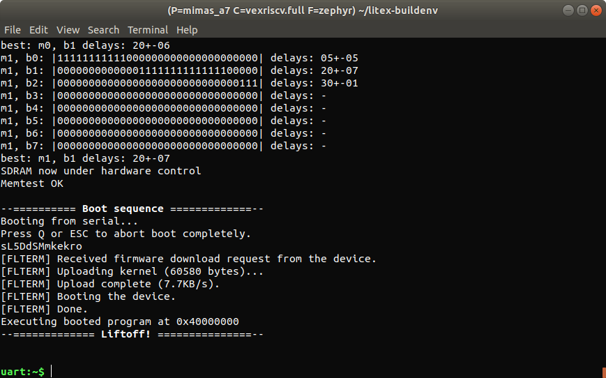 Congratulations on getting the Zephyr OS running successfully on the Vexriscv RISC-V CPU built with LiteX on your Mimas A7 FPGA Development Board!