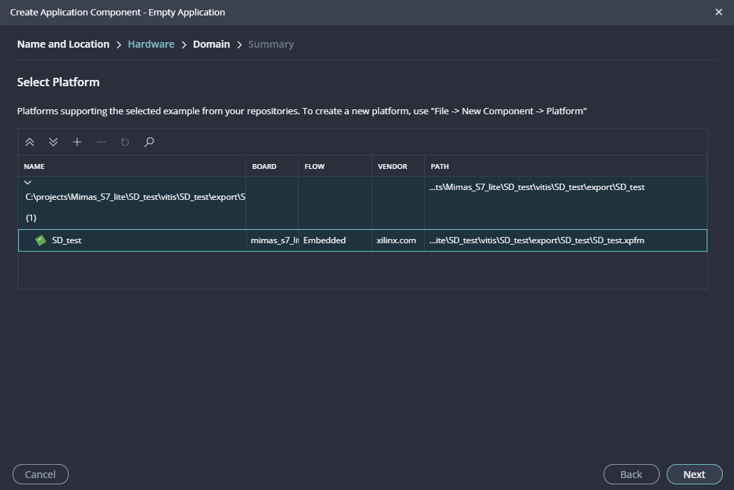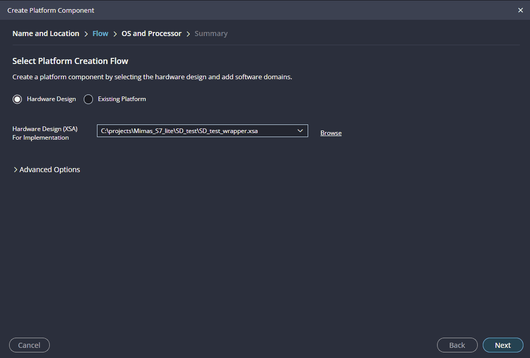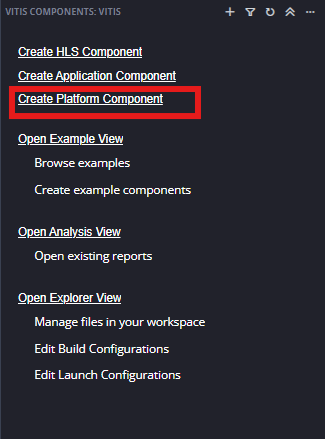 Create a new platform for the project, by selecting “Create Platform Component”, click “Next”, in the Flow tab select the XSA file saved using the step 20 and finally click “Next” and “Finish” respectively.