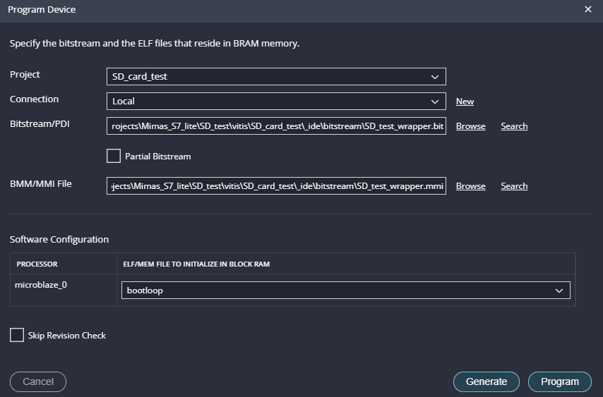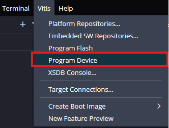 Program the FPGA on Mimas S7 lite with a simple boot loop program by selecting the Program Device option from the Vitis menu.