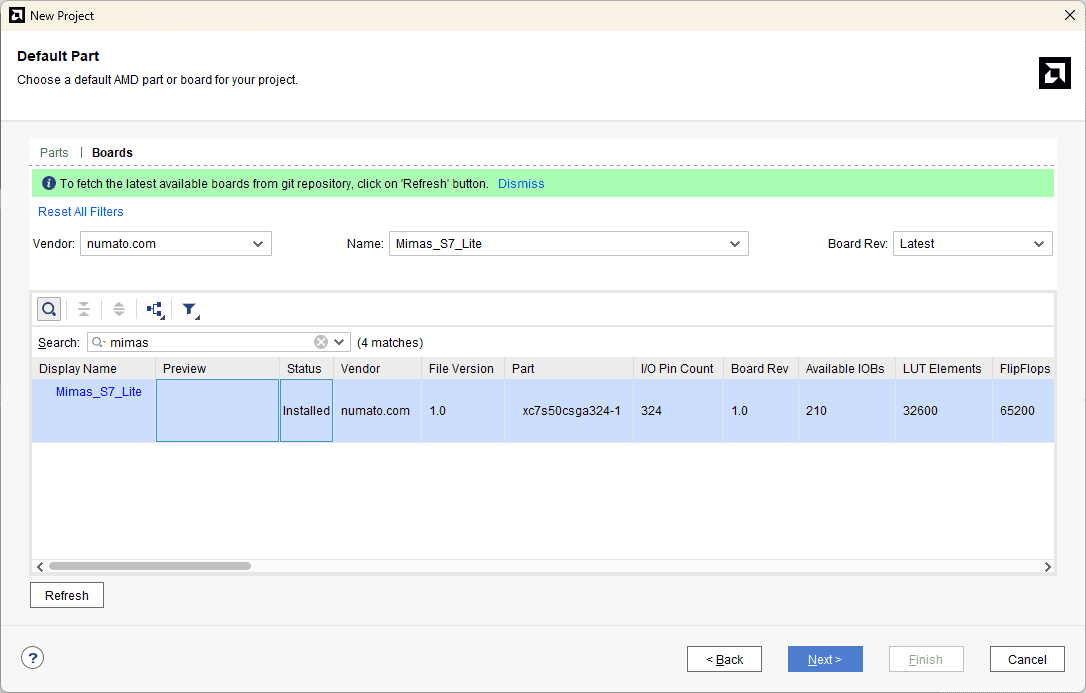 In the Default Part window, select “Mimas_S7_lite” from the Boards option. If Mimas_S7_lite is not listed, make sure board support files are installed correctly. Click Next to continue.