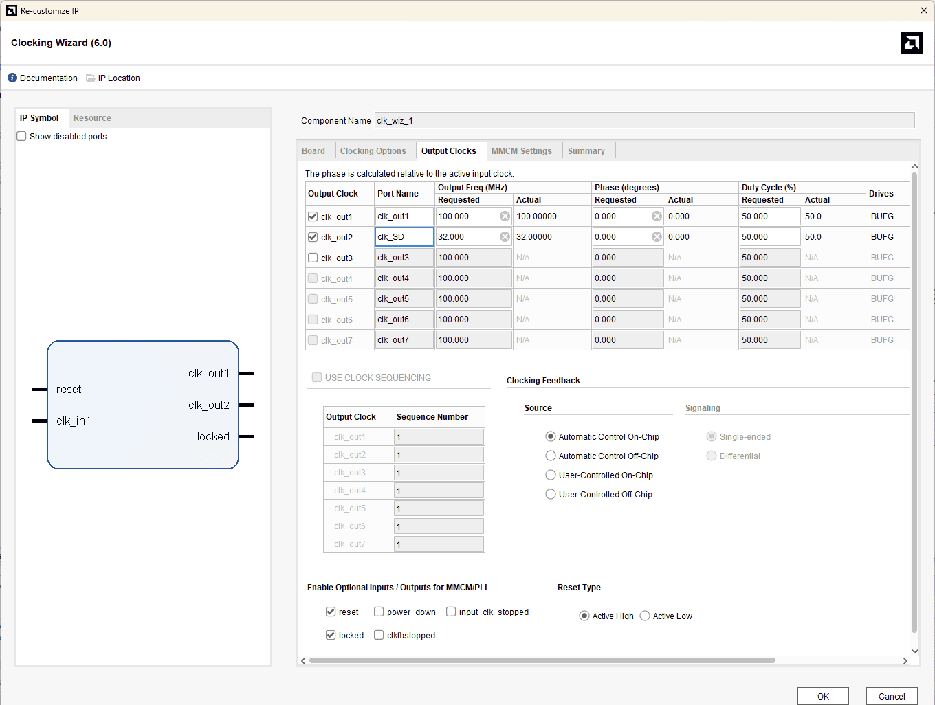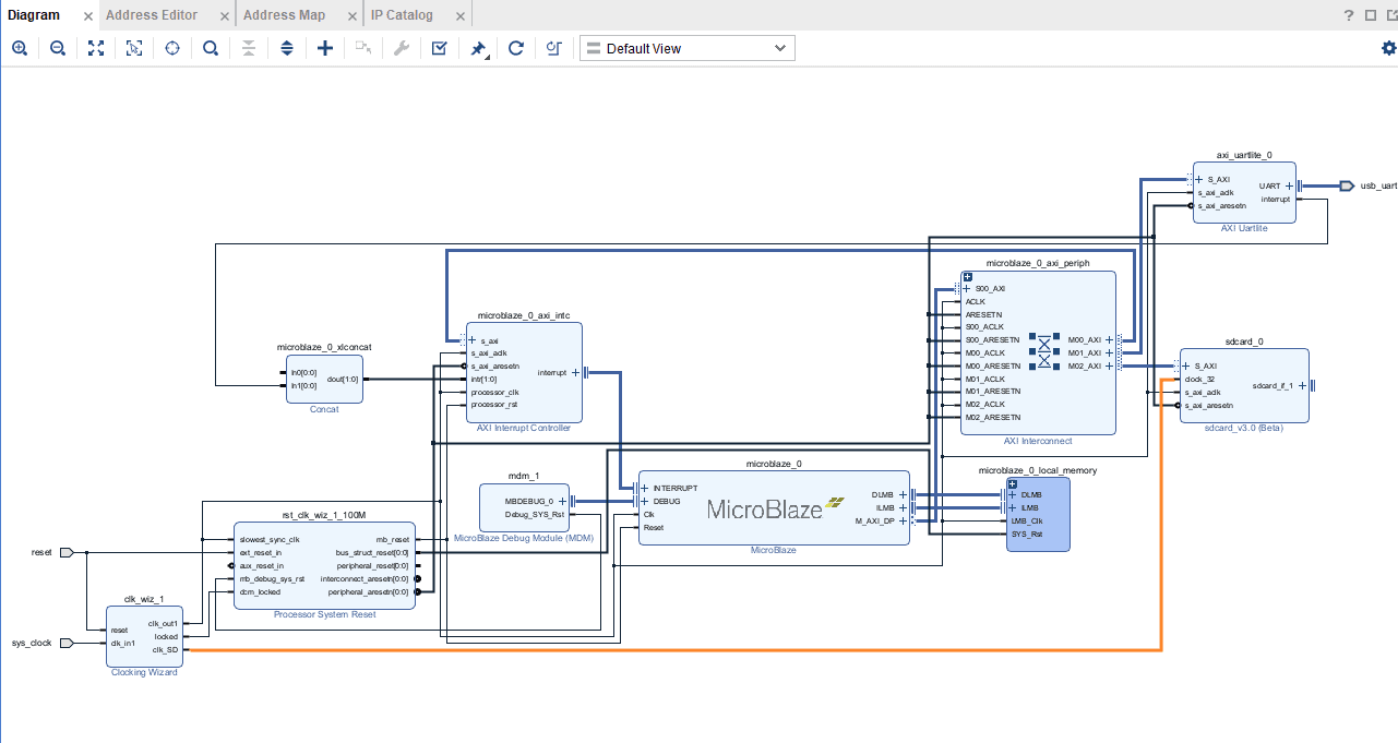 Now, connect the clock_32 pin of the SD card IP to the clk_SD pin of the Clocking wizard as shown in the below figure.