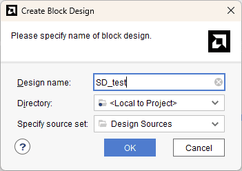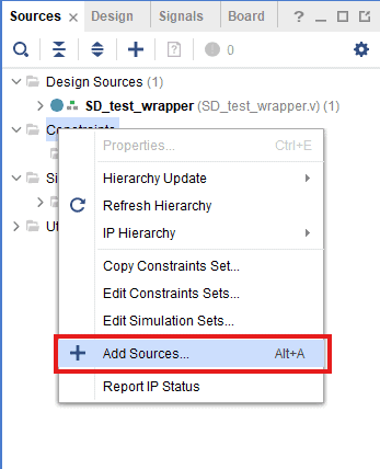 Right-click “SD_test” in the “Sources” window, and select “Create HDL Wrapper” from the popup menu. Click “OK” on the window that appears to finish generating a wrapper.