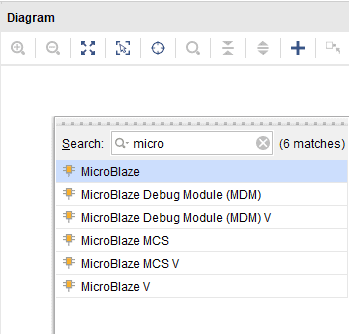 Go to Diagram window, right click and select “Add IP” from the popup menu. Search for “MicroBlaze” and add it to the design by double-clicking it.