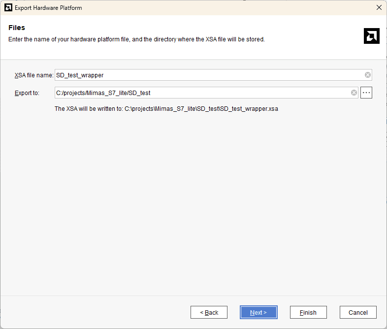 Provide the XSA file name and save it at a suitable location. Click Next and click Finish in the next dialog box.