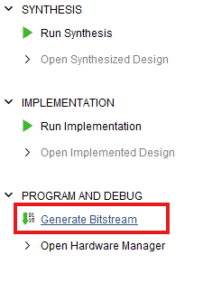 Click “Generate Bitstream” under the “Program And Debug” section to synthesize, implement and generate a bitstream.
