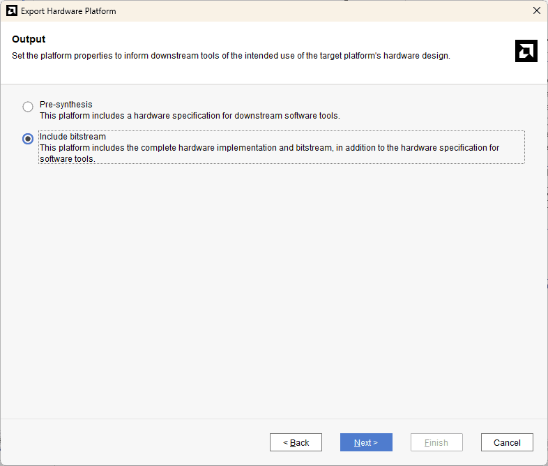 After generating the bitstream successfully, select Export -> Export Hardware from the File menu. Click Next.