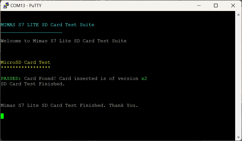 print("\r\n\r\n\e[1;36mMIMAS S7 LITE SD Card Test Suite\e[0m\r\n");