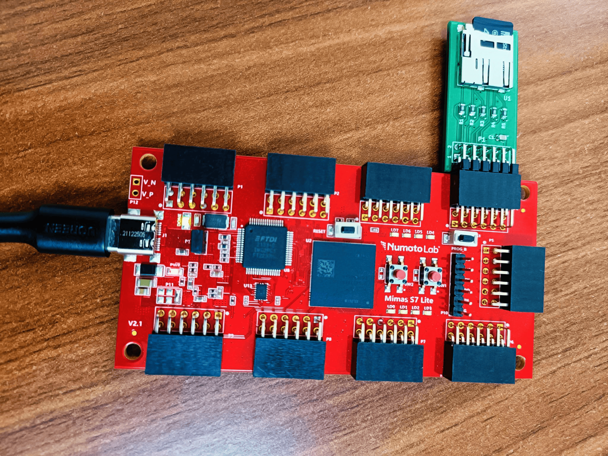 Once the Project is Built, Set up the hardware for testing the design. For this, Connect ‘Header P1 ’ of SD Card Module to ‘Header P4’ of Mimas S7 Lite and insert the SD card in the SD card slot of the Expansion Module. Finally, connect USB type ‘C’ Cable for powering up Mimas S7 Lite.