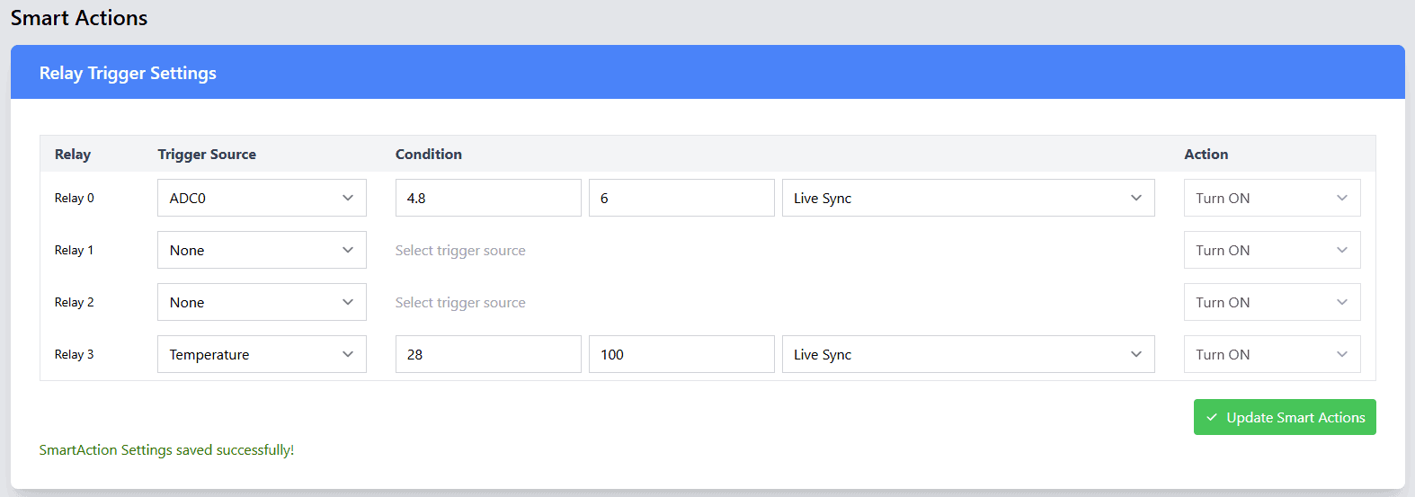 - ADC Channels – Automatically control relays when analog values fall within a defined range.