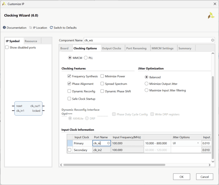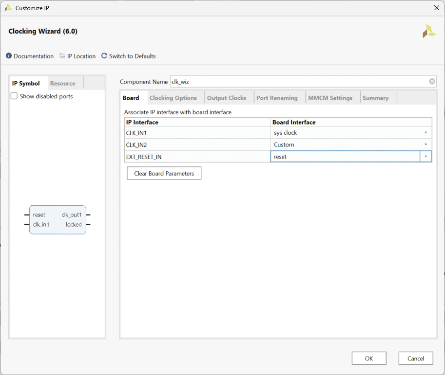 Search for “Clocking Wizard” IP and double-click on it to customize. Choose component name as “clk_wiz”, select “CLK_IN1” board interface to ‘sys_clock’ and “EXT_RESET_IN” to ‘reset’ in the “Board” tab. In “Clocking Options” choose primary clock port name as “clk_in”, clk_out1 port name as “clk_200”, requested frequency as “200.000”, de-select locked signal and select “Reset Type” as “Active Low”. Click “OK”.