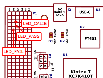 FPGA pins K23, H22 and F25 which are in 2nd column of GPIO Header P1 are connected to led_calib, led_pass and led_fail signals respectively. After programming make sure that led_calib (calibration done) signal goes HIGH indicating that initial calibration completed successfully. Also, led_pass should go HIGH indicating that data written to memory and read back successfully. led_fail should stay LOW since led_fail being HIGH indicates failed attempt to write and read data from memory. The below picture illustrates the FPGA pins on the Callisto Kintex 7 FPGA Module GPIO header used for status indication.