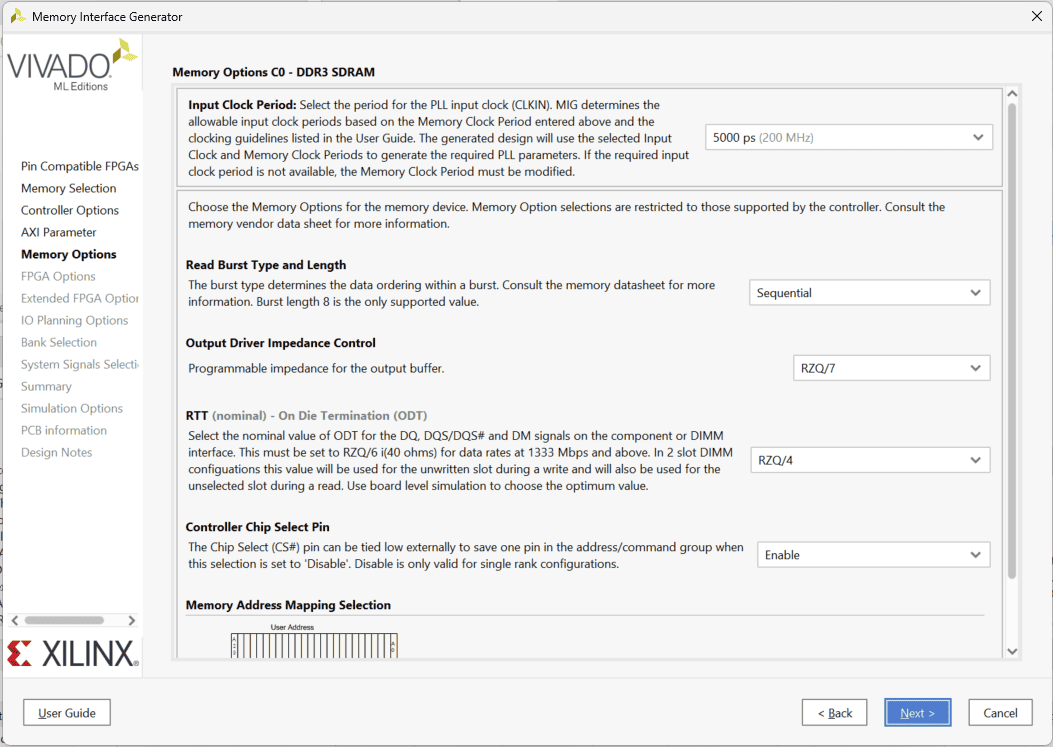 The “Xilinx Memory Interface Generator” configuration window will open. Click “Next”, select component name and de-select “AXI4 Interface”. For this article, author used “mem” as component name. After clicking on “Next” twice, select “DDR3 SDRAM” as Memory. Click “Next”. Select controller options as shown below and Click Next. Select “Input Clock Period” as “5000 ps (200MHz) “, keep remaining settings as default. Click “Next” to proceed.