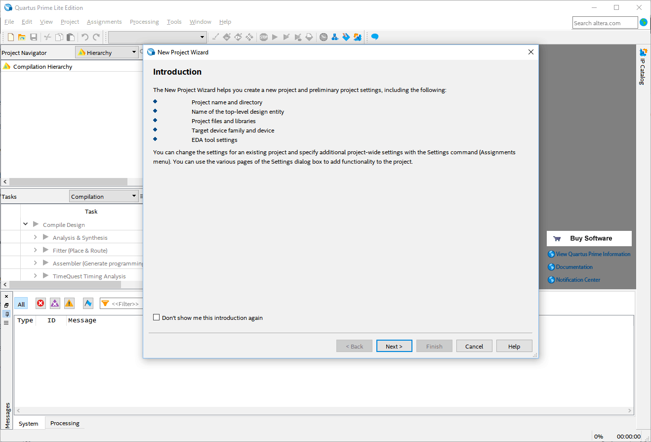 Open Quartus software and select “File” -> “New Project Wizard” from the menu bar. A “New Project Wizard” dialog will open. Click “Next” to proceed.