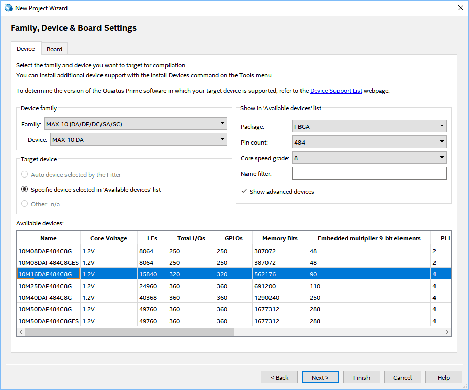 Go to the “Family, Device & Board settings” tab by clicking “Next” for three consecutive times. Select the Device (10M16DAF484C8G or 10M50DAF484C8G as per your Telesto variant) as shown below and click “Next” to proceed.