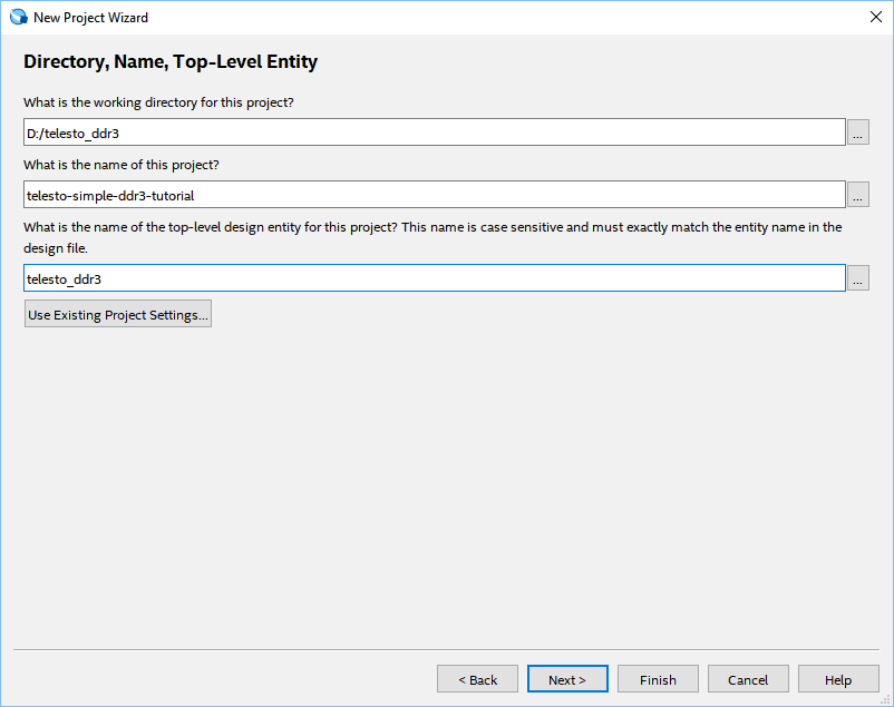 Enter a name for the project and select a convenient project location and top-level entity name. For this article, author used “telesto-simple-ddr3-tutorial” as the project name and “telesto_ddr3” as the top-level entity name.