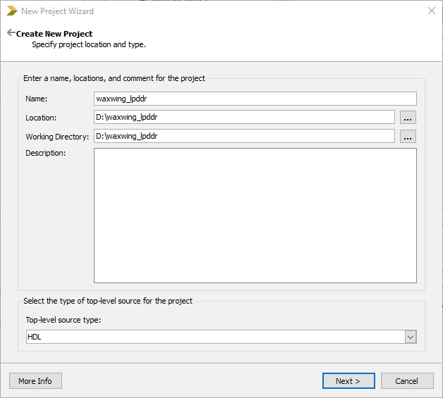 The following steps will walk you through the process of creating simple LPDDR project for Waxwing using Xilinx ISE.