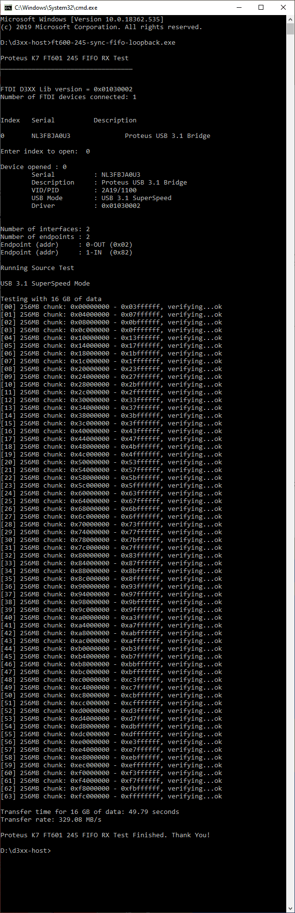 This will create the executable file required to test the project. Now, program Proteus Kintex 7 USB 3.1 Development Board with the bitstream (available in “build_proteus_k7_160t” folder), that was generated by running the Python file, using the Tenagra application (refer the Tenagra article to program the Proteus). After the board is programmed, browse to the directory in which the executable file is present and open Command Prompt and run the executable file. (Refer the image below)