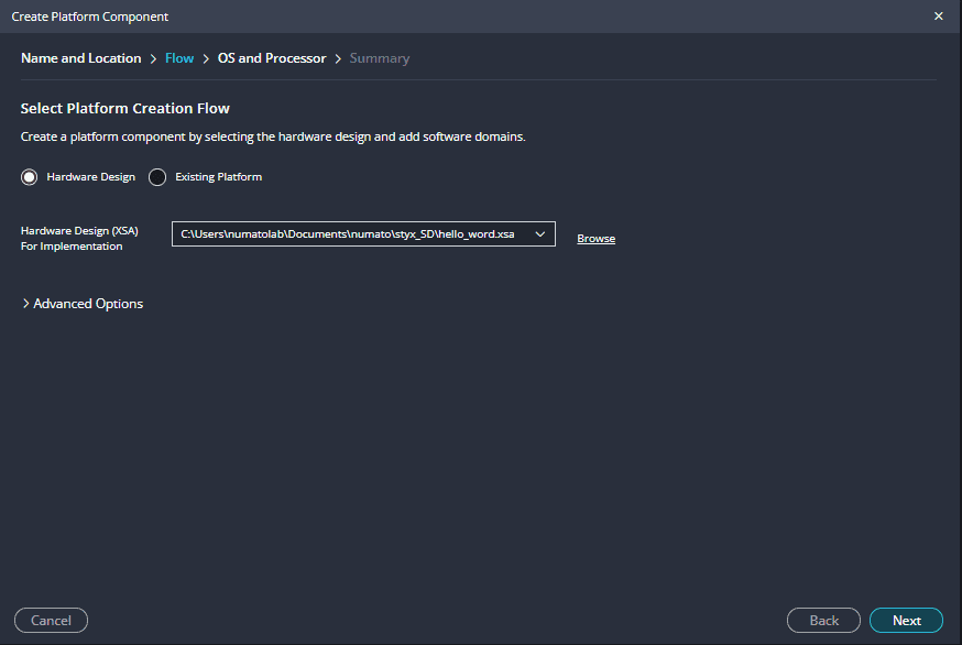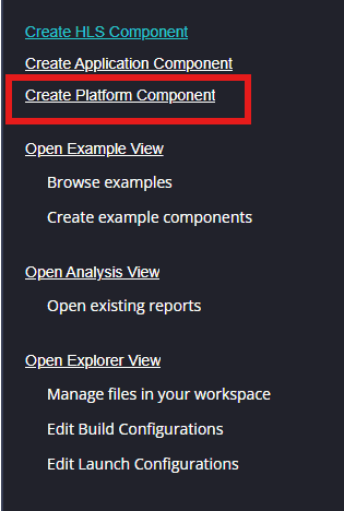 Create a new platform for the project, by selecting “Create Platform Component”, click “Next”, in the Flow tab select the XSA file saved using the step 14 and finally click “Next” and “Finish” respectively.