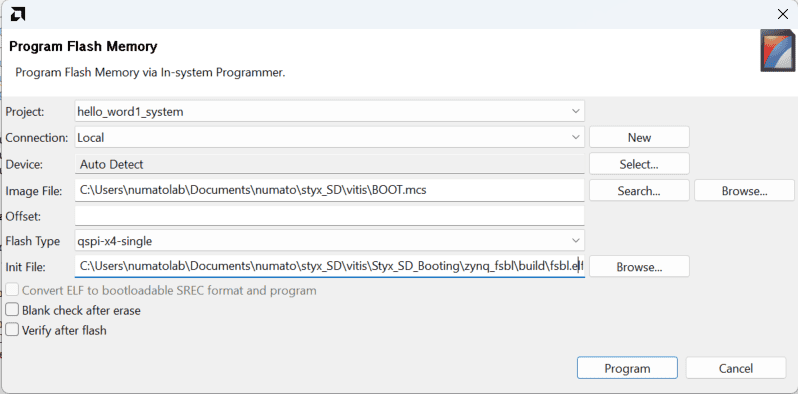 Step 2: After BOOT.mcs file is generated, make sure to configure channel B of the onboard FT2232H USB – Serial device as virtual communication port using FT_Prog. The process is very similar to that of Saturn and details are available here. Then, change the Styx boot mode to QSPI Flash Boot Mode by following instructions in the Styx User Manual. Connect the micro USB cable and Xilinx Platform Cable USB II to Styx and then power up the board. Program the flash memory by selecting BOOT.mcs image file in the Vitis-> Program Flash.
