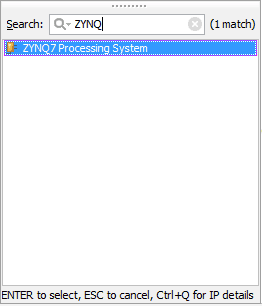 Go to Diagram window, right click and select “Add IP” from the popup menu. Search for ZYNQ7 Processing System. Add ZYNQ7 Processing System to block design by double-clicking. A Zynq7 Processing System IP block will be added in the block design.
