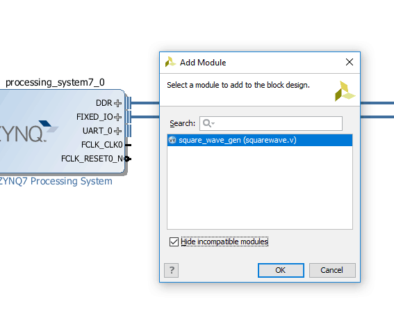 Again right-click in the Diagram Window and select “Add Module…”. Select “square_wave_gen” from the options and click “OK”.